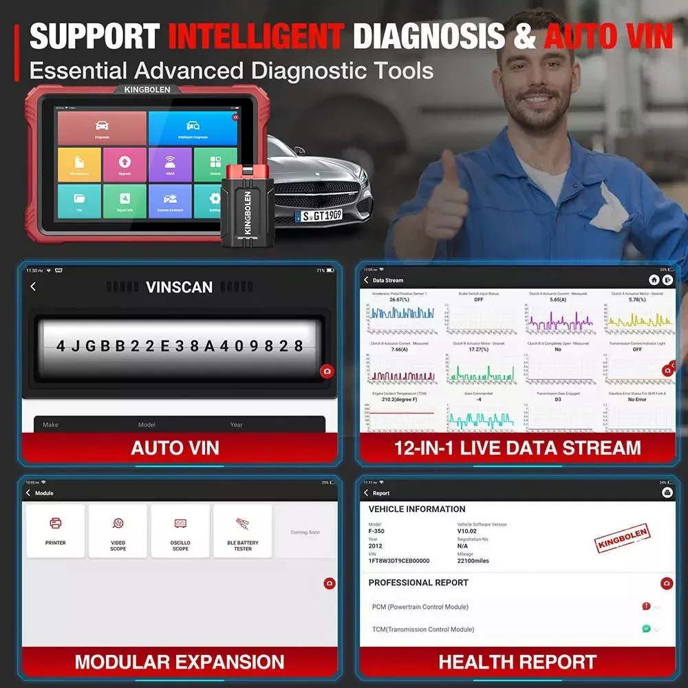Der KINGBOLEN K10 Pro Bluetooth OBD2 Scanner unterstützt die vollständige Systemdiagnose.Mit einem Klick Scannen aller Steuergeräte kann es Fehlercodes lesen/löschen, Echtzeitdaten/Einfrierrahmen lesen, Modulinformationen steuern und Test- und Reset-Funktionen für RDKS, ECM, BCM, ABS, SRS, TCM, BMS, SAS, A/C, RTM-Systeme ect. durchführen.Der K10 Pro Scanner unterstützt die meisten Fahrzeuge nach 1996 über 110+-Automarken und 38-globalen Sprachen (EN, FR, ES, DE, IT, RU, PT, JP, TU, POL...)